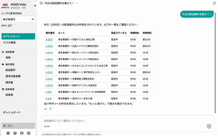 MOVO Vistaに蓄積した配送案件データを、対話形式で簡単に検索・分析できるようにしている。これまでAI活用の中心だった本社部門だけでなく、物流拠点で働く現場担当者にもAIを届け、迅速な対応やデータに基づく意思決定を可能にすることを目指す。