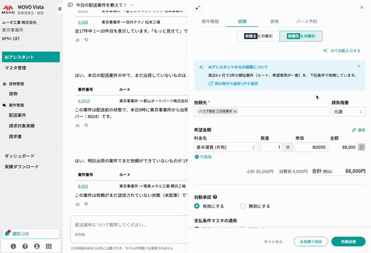 回答から案件詳細にアクセスし、必要に応じて依頼送信などの操作へつなげられるように配慮している。同社が2025年11月に提供を始めた「AIによる依頼先・依頼金額の自動提案機能」にもアクセスが可能。