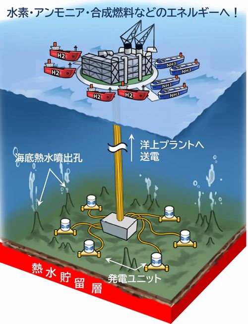 さらに、海底熱水を活用した「海底での発電→洋上プラントで水素・アンモニア・合成燃料製造→船舶はじめ幅広く燃料供給」との一連のバリューチェーン構築も念頭に置いている。