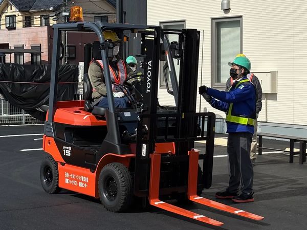 フォークリフト運転技能講習で定められている講習内容に基づき、走行や荷役に関する装置の構造と取り扱い方法、運転に必要な力学、関係法令などに関する知識を学ぶ座学での講習と、座って操作するカウンター式フォークリフトによる基本的な走行操作からフォークの差し込みや荷物の積み降ろし、配置などの荷役操作、爪の操作や重心移動の理解、安全確認などの実技講習を実施する。