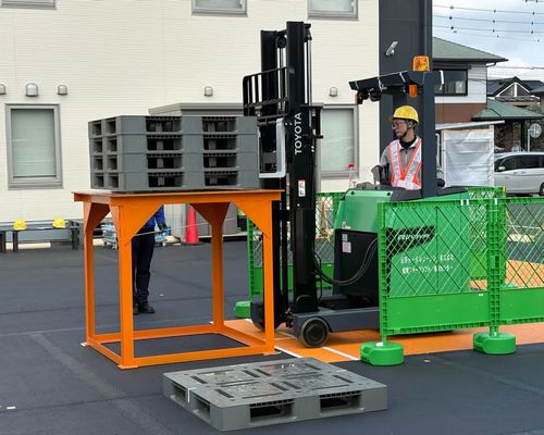 現場で使用されることが多い、立って操作するリーチ式フォークリフトを使用した走行操作や荷役操作(フォークの抜き差し、荷物の積み降ろし、配置など)、安全確認などの研修を通じて即戦力となる技術の強化を図る。