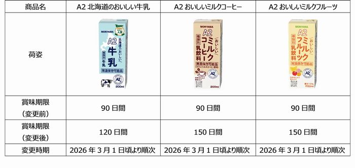 同様に、「A2おいしいミルクコーヒー」「A2おいしいミルクフルーツ」は賞味期限を90日から150日に延長する。