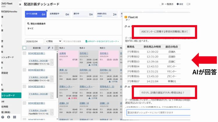 新機能は、AIの回答が計画名・車両名・ドライバー名・到着予定時刻などを一覧表の形で表示。複数の情報をまとめて確認できるため、状況を迅速に把握できるとみている。