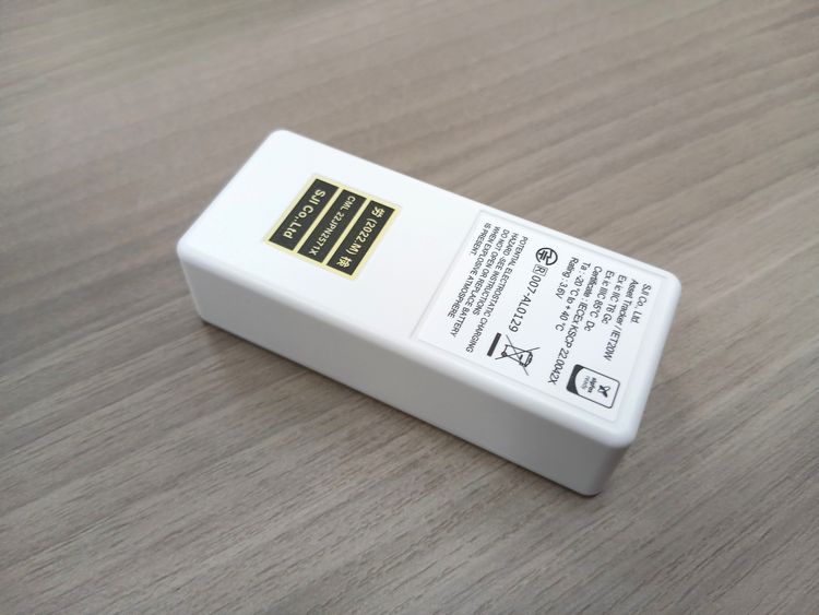 サントラッカーの専用小型端末。縦7.5cm×幅3.3cm×高さ2cm。パレットに取り付ければ現在位置や状態をリアルタイムで把握できる
