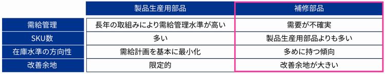 製品ライフサイクルの変化、環境・安全に関する制度対応の拡大、新技術の導入、仕様の細分化などを背景に、補修部品事業は管理すべき在庫品目数(SKU)が増加傾向にあり、従来のオペレーションのままでは競争力の維持が困難になっている上、迅速な納品を求められる特性を持ち欠品回避が優先されるため、製品事業と比較して需給管理や在庫配置が本質的に難しい領域となっている。さらに、在庫拠点は国内外に及ぶためグローバル全体での在庫管理の最適化を図ることが求められている。