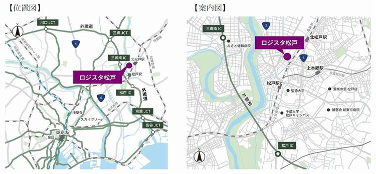 松戸市は東京都葛飾区に隣接し、東京23区内への消費財・生産財の配送拠点として至便で、外環道を利用した関東広域輸送も可能のため、広域配送にも対応できると想定している。外環道の三郷南ICまで約3.5km、松戸ICまで約5.1km。