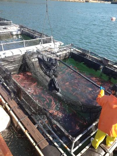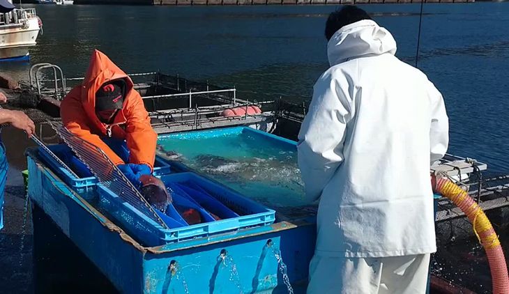 養殖いけすから真鯛を取り出す様子