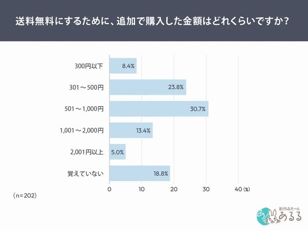 送料無料にするために追加購入した金額を尋ねると、「301~500円」が23.8%、「501~1000円」が30.7%で、301~1000円の範囲で追加購入すると答えたのが全体の5割以上を占め、送料分と同程度もしくはそれ以下の範囲で追加購入を行う傾向が見られると指摘している。