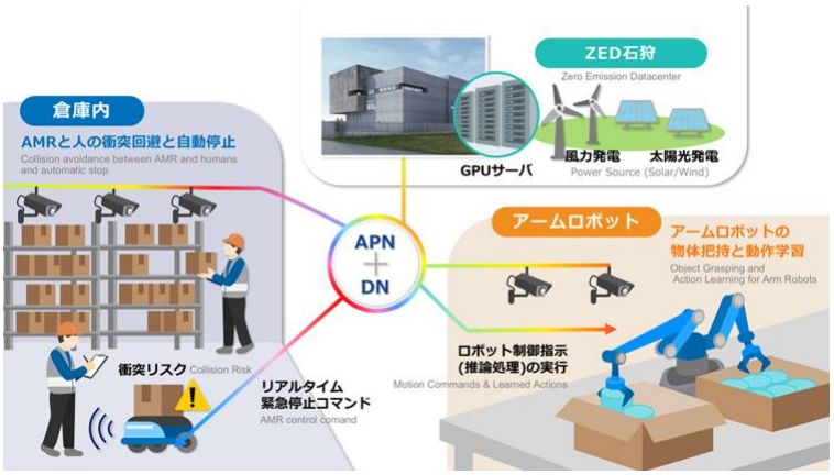 北海道石狩市の「ゼロエミッション・データセンター石狩」(ZED石狩)と、千葉県流山市の物流倉庫をNTTの次世代高速通信基盤「IOWN APN」(アイオンAPN)で結び、ロボット制御や画像解析に必要なAI処理を遠隔地のZED石狩に集約する「エコセントラルコンピューティング」の検証を実施。
