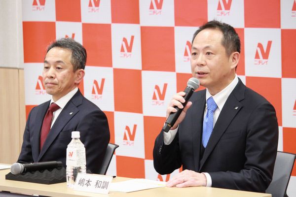 ニチレイの大櫛顕也社長と、4月1日付で後任の社長に就任する嶋本和訓取締役上席執行役員(ニチレイロジグループ本社社長兼務)は3月24日、東京都内のニチレイ本社内で新体制発足を前に記者会見した。