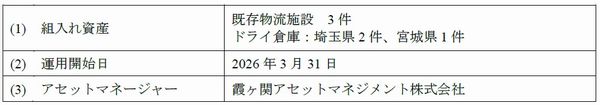 ファンドに組み入れた物件は汎用スペックを備えたドライ倉庫で、埼玉県が2件、宮城県が1件。詳細は開示していない。