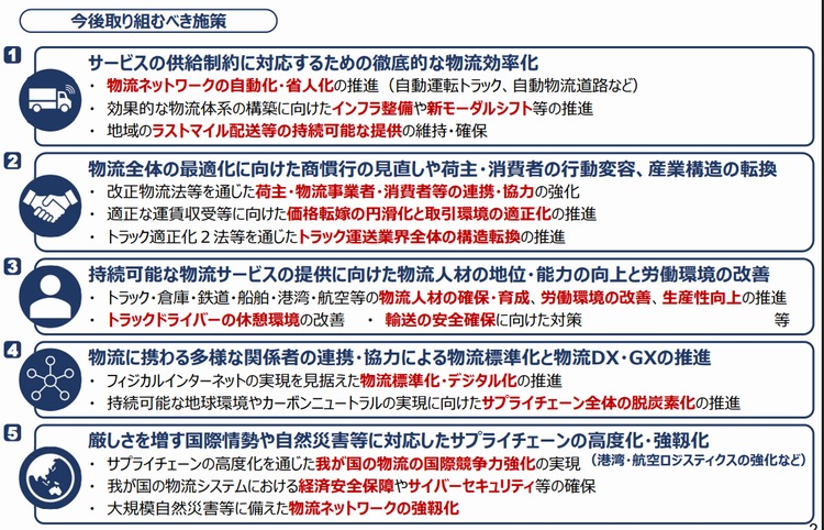 その上で、①徹底的な物流効率化②商慣行の見直しや荷主・消費者の行動変容③物流人材の地位・能力の向上と労働環境の改善④物流標準化と物流DX・GXの推進⑤厳しさを増す国際情勢や自然災害などに対応したサプライチェーンの高度化・強靱化-の5分野でそれぞれ施策を展開することを示している。