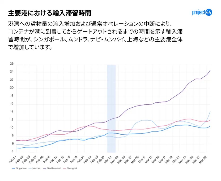 project44は「ホルムズ海峡の通航再開の明確な見通しが立たない中、この混乱は新たな局面に入りました。それは、航路変更の量ではなく、それを受け入れる港湾における混雑の深刻化によって特徴づけられる段階です。データは、状況が緩和に向かう前に、さらなる圧力の高まりが続く可能性を示唆しています」とコメントしている。