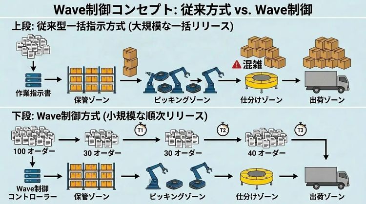 Wave制御は作業指示件数、設備使用状況、リソース状況などを考慮し、倉庫内の作業指示を複数のグループに分け、時間差で順次開始する仕組み。一般には「バッチ制御」とも呼ばれる。