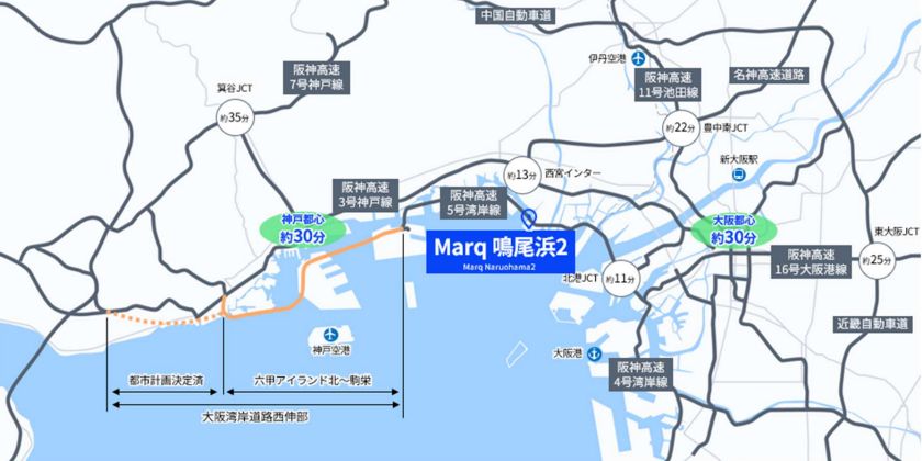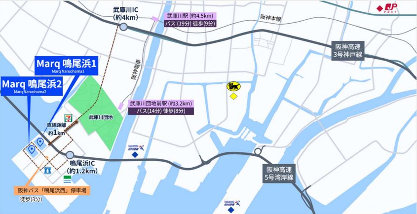 鳴尾浜エリアは冷凍・冷蔵倉庫が集積しており、大阪湾岸部に近接している。阪神高速5号湾岸線の鳴尾浜ICから約1.2km。関西の広域をカバーできる立地と見込む。