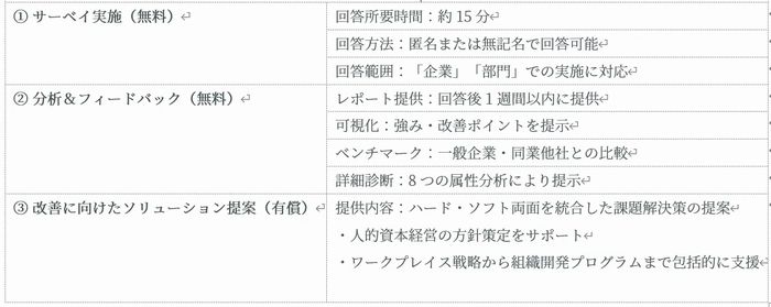 新サービスは組織・人材課題と職場の環境を一体で捉え、改善へ導く統合型サービスを標ぼうしている。