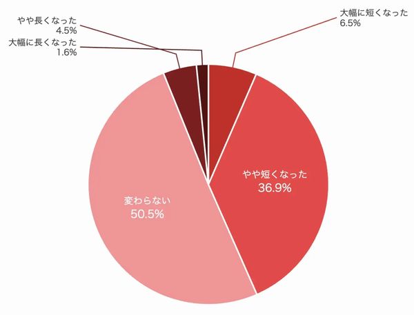 「変わらない」(50.5%)が過半数を占め、拘束時間の体感としては“横ばい”が中心であることが分かった。一方で「やや短くなった」(36.9%)も4割近くに上り、Hacobuは働き方改革の影響が現場の実感として表れ始めているとみている。