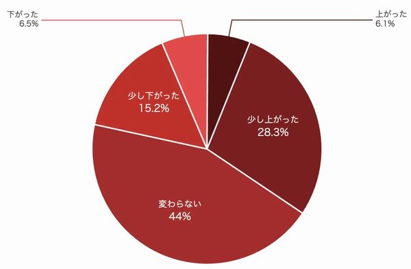 「変わらない」(44.0%)、「少し下がった」(15.2%)、「下がった」(6.5%)の合計が6割以上に届き、賃金が上がった実感を持てない層が中心になっている。