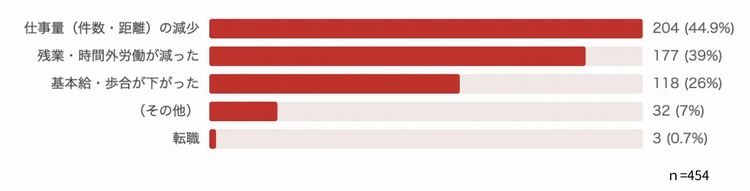 最多は「仕事量(件数・距離)の減少」(44.9%)で、その次が「残業・時間外労働が減った」(39.0%)だった。