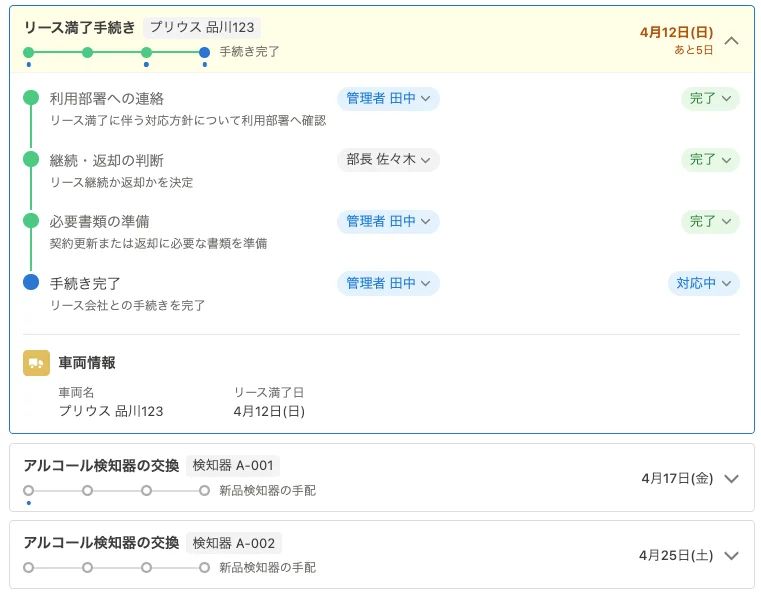 管理者が迷わずに次の具体的なアクションを起こすための仕組みを整え、車両管理の負担の根本解消を目指す。