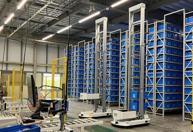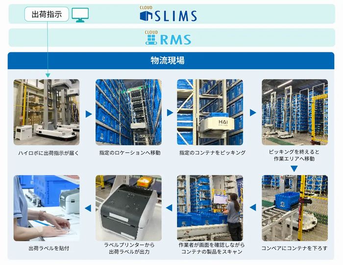 SLIMSとハイロボの連携で作業フローを自動化し、作業者は倉庫内を移動せずにピッキングすることが可能になった。作業時間は約60%短縮し、高さ5mのラックを活用することで保管効率は約2倍に向上、省スペースでの生産性向上も達成しているという。