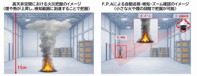 F.P.AとPTZカメラを組み合わせることで、高天井空間や広い監視エリアでも監視装置と火元との距離の影響を受けにくい形で、早期の異変把握とより迅速な初動対応を可能にすると見込む。