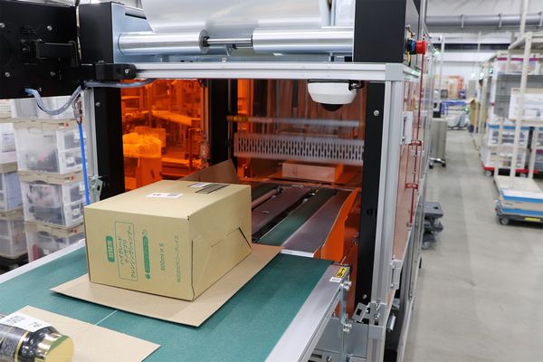検品・梱包領域ではメール便サイズの自動包装機と、シュリンク包装機能付き封函機が入った。メール便サイズの包装機は1時間当たり約1000件の処理能力を持つ設備を2機導入した。送り状の発行から梱包まで行われる。