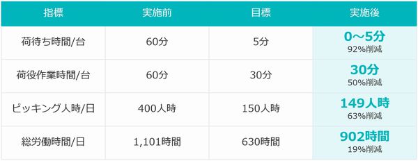 自動化設備をフルに活用した結果、2月初旬に実施した10日間の効果測定では、ピッキング工程に投入していた作業者数を1日平均で以前の半分以下の21人まで減らせたほか、同拠点のトラック1台当たりの荷待ち時間は60分から92%減の5分へ大幅に短縮できたという。