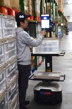ピッキング現場には110台のAMRが導入された。STOCKCREWが取り扱う2200社のうち約7割は個人事業主で、細かな商品の取り扱いも少なくない。これまで作業スタッフが庫内を歩き回ってピッキングをしていたが、導入後はAMRが倉庫内を動き回り、各保管区画に配置されたスタッフがAMRに商品を入れる方式に切り替えたことで移動ロスをなくした。