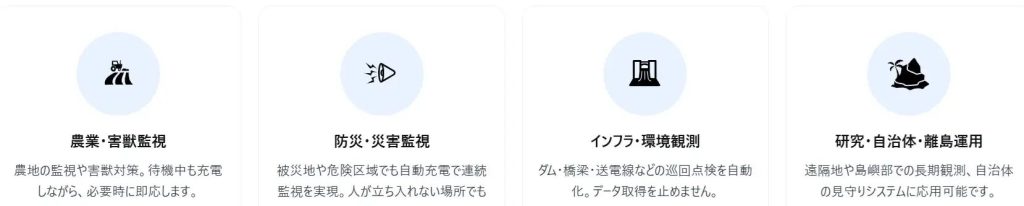 ドローンを運用する際、従来は人手によるバッテリー交換や充電作業が必要で完全自動運用の障壁となっていた。そのため、新製品の販売にこぎ着けた。