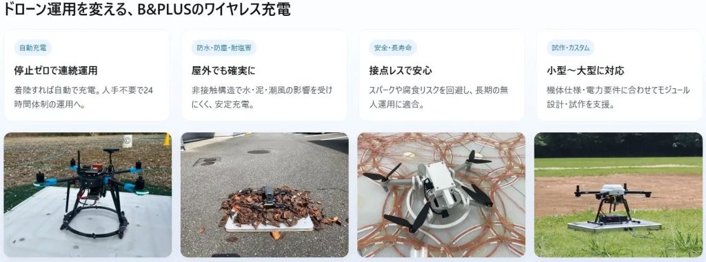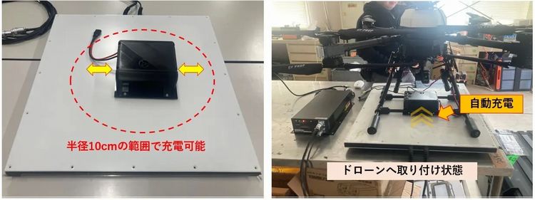 着陸するだけで自動的に充電を開始するワイヤレス給電方式を採用し、産業用ドローンの無人運用を後押しする。