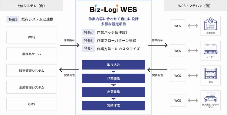 WMS(倉庫管理システム)をはじめとするさまざまな上位システムと柔軟に連携できるよう設計。上位システムでは対応しきれない、具体的な作業の進め方や実施方法の設計を「Biz-Logi WES」で管理し、運用面をカバーする。