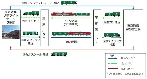 JR貨物とJR貨物ロジ・ソリューションズ、東京製鐵、廃棄物輸送を手掛けるマルストランスポーテーション(川崎市)の4社は4月24日、CO2排出量削減のため、鉄スクラップの鉄道輸送を5月に開始すると発表した。