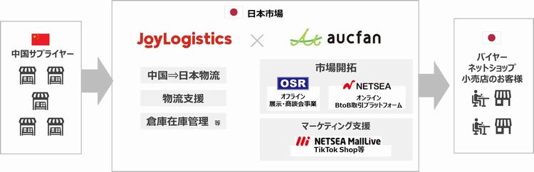 京東物流が展開する国際物流サービス「JoyLogistics」(ジョイロジスティクス)が有している中国国内と越境物流のネットワークと、オークファングループが手掛けている日本市場の販売・マーケティング支援のノウハウを組み合わせ、中国のサプライヤーと日本市場をつなぐ越境流通の拡大を目指す。