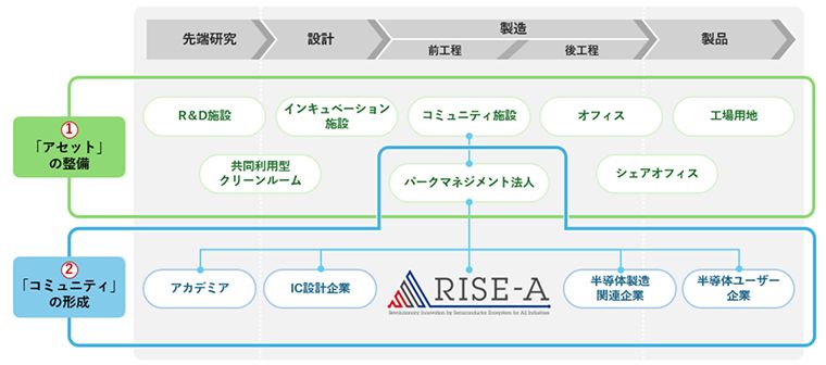 三井不動産はまた、熊本県とともにパークマネジメント法人を設立・運営する。プロジェクトに参画する企業・アカデミアを中心に、半導体関連産業の振興を図る一般社団法人RISE-A(ライズ・エー)のネットワークも活用して、熊本と国内外の企業・アカデミアがつながる産官学コミュニティーの形成を図る。