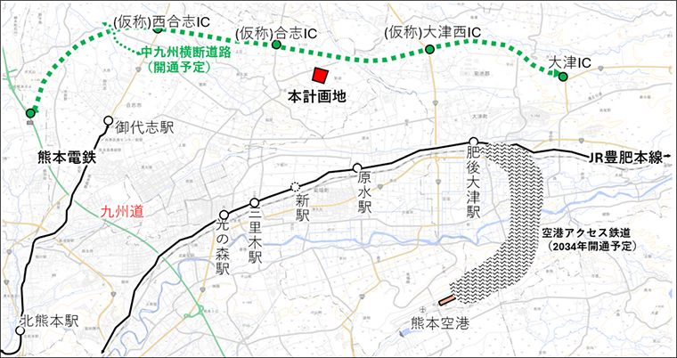 周辺県道の新設・拡幅とともに整備中の中九州横断道路(仮称)合志ICから約2kmに位置している。